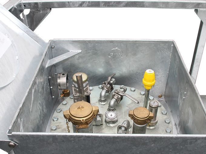 Alle Armaturen in einem flüssigkeitsdichten Staukasten mit abschließbarem Deckel